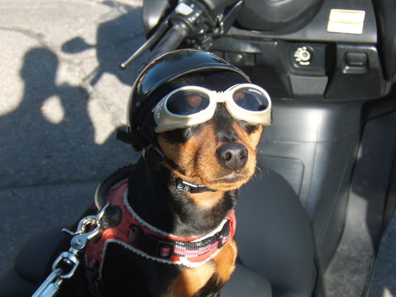 Ok, you can't laugh as he does get a complex, but I just had to share this picture of my bad ass biker dog. His helmet just came in today. He loves going for scooter rides. As soon as I say, "Wanna go on the scooter?" he jumps out the door and up onto the scooter. He has a little harness designed to fit on the scooter so he stays safe.