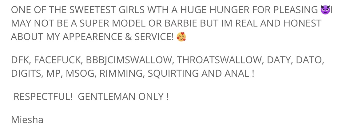 Hi, thank you for the interest. My name is Miesha, formally Milla! an exotic mistress! as you can see from my photos I am blessed with a beautiful natural look that a number of gentleman have spoken as being unique because of my mixed race. I pride myself on being a natural beauty so I wear very minimal makeup but still maintain a sight for sore eyes.