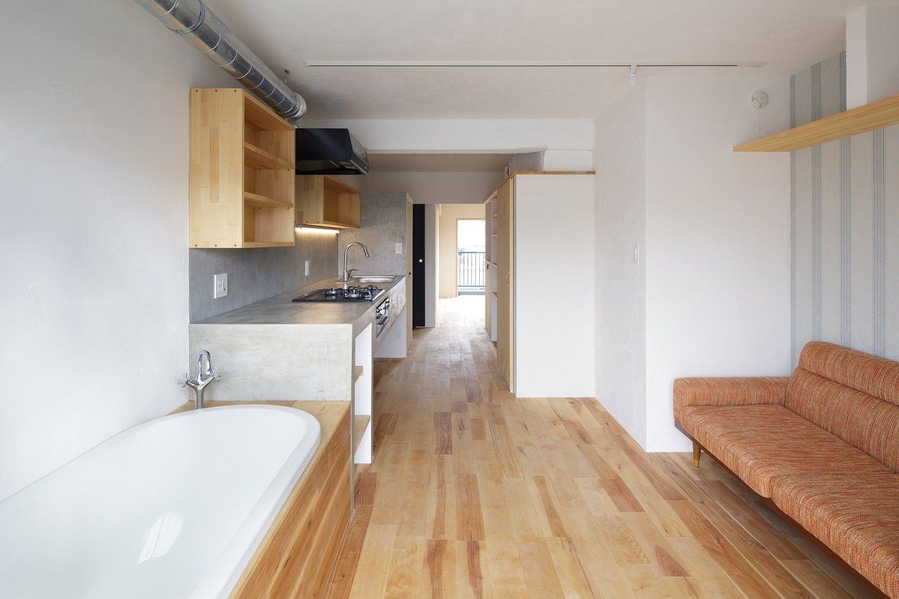 His latest model, a one-bedroom apartment, fulfills all of his seven rules for a konkatsu apartment, including a spacious kitchen and shower room, so couples can cook and bathe together. The home has plenty of windows to let in natural light and was remodeled with natural construction materials such as earth with fossilized algae.